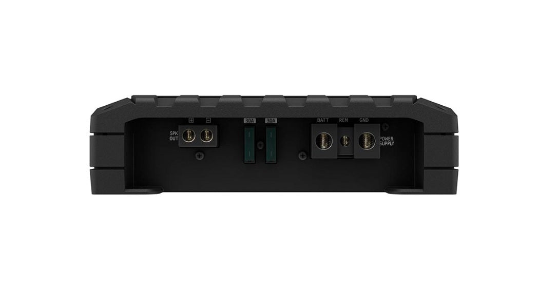 The speaker and power cable terminals are conveniently located on the left side of the amplifier to allow a clean installation.
