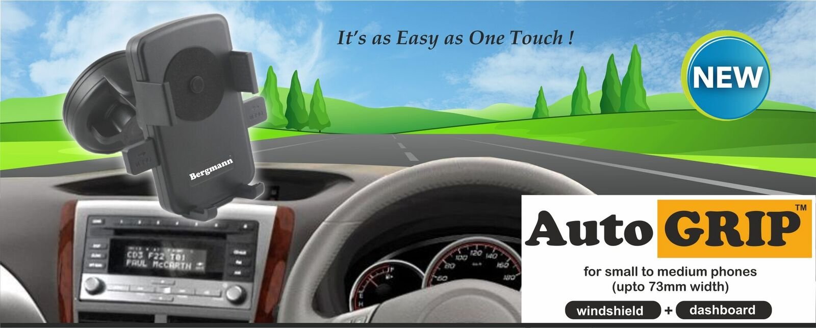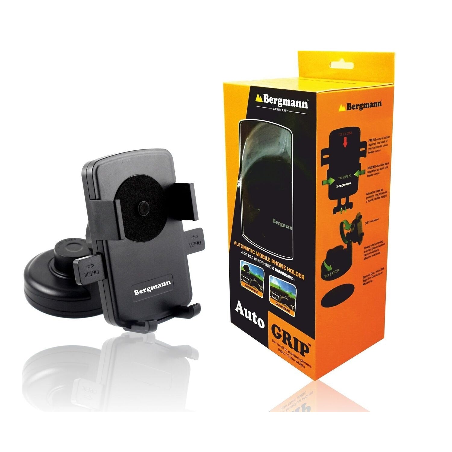 Bergmann (Germany) auto grip range of automatic mobile phone holders are designed to securely and instantly mount mobile phones in your car. Simply place the phone on the mount and it gets locked instantly and automatically. To release, simply press both the open bars together which are located on each side of the mount.