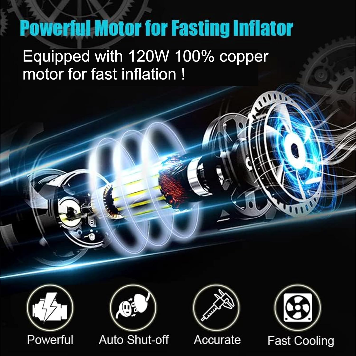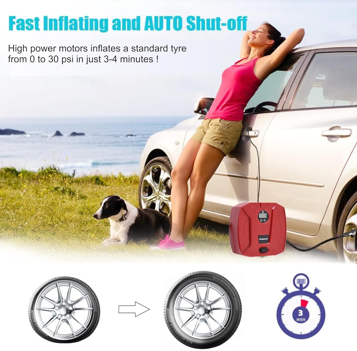 - DC 12V, 120 W, 100% pure copper motor, portable tyre inflator