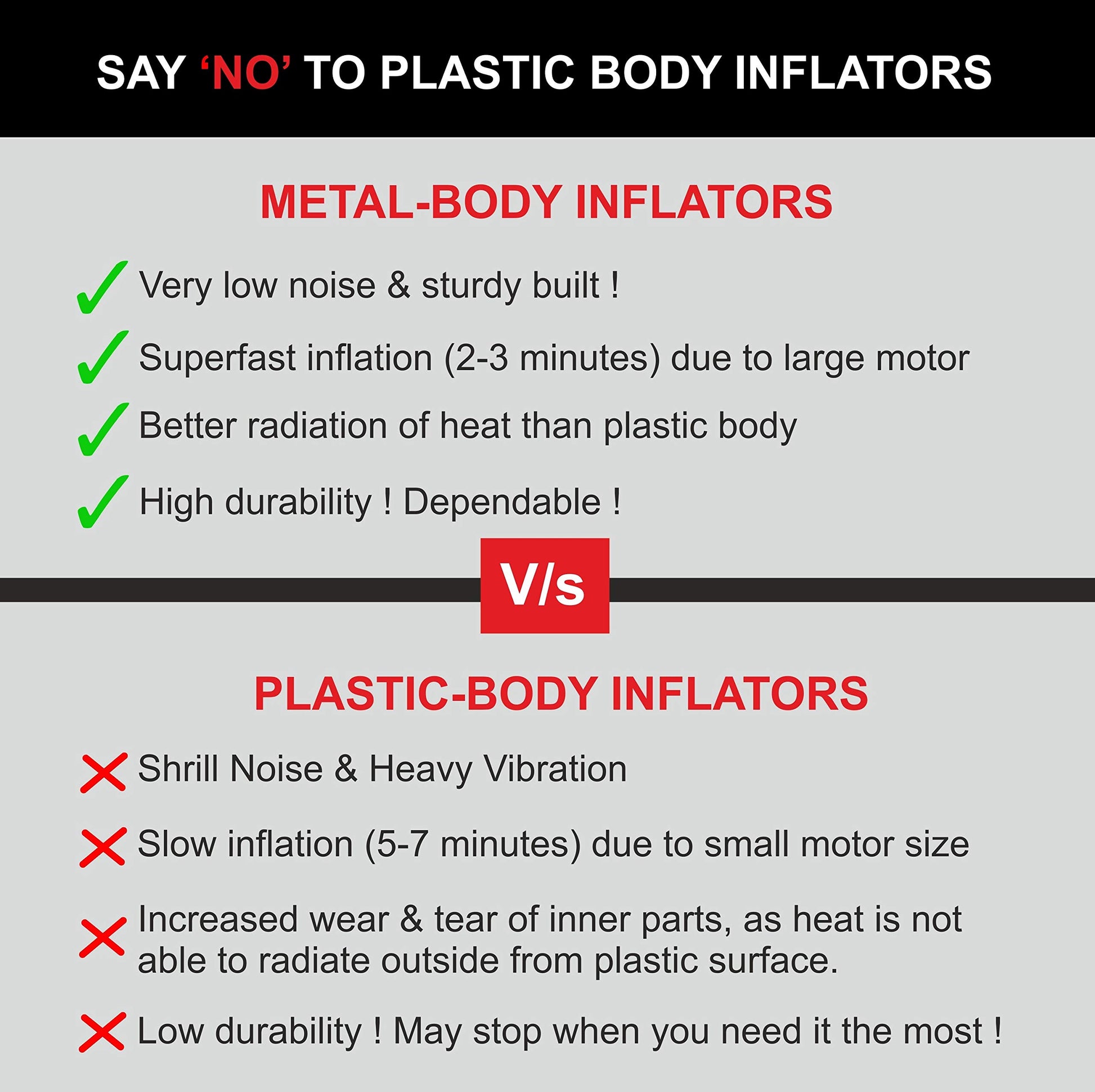 You also have a bright LED light which would prove very handy during use in dark or low light conditions. Its high quality braided (knitted) rubber air-hose is heat and wear resistant. Durable metal body is grounded by anti-vibration rubber feet to prevent unwanted movement. There is no periodic maintenance required and the design is oil-free. Extra nozzles have been provided for inflating toys, balls and water sport equipment. Overall a great product !