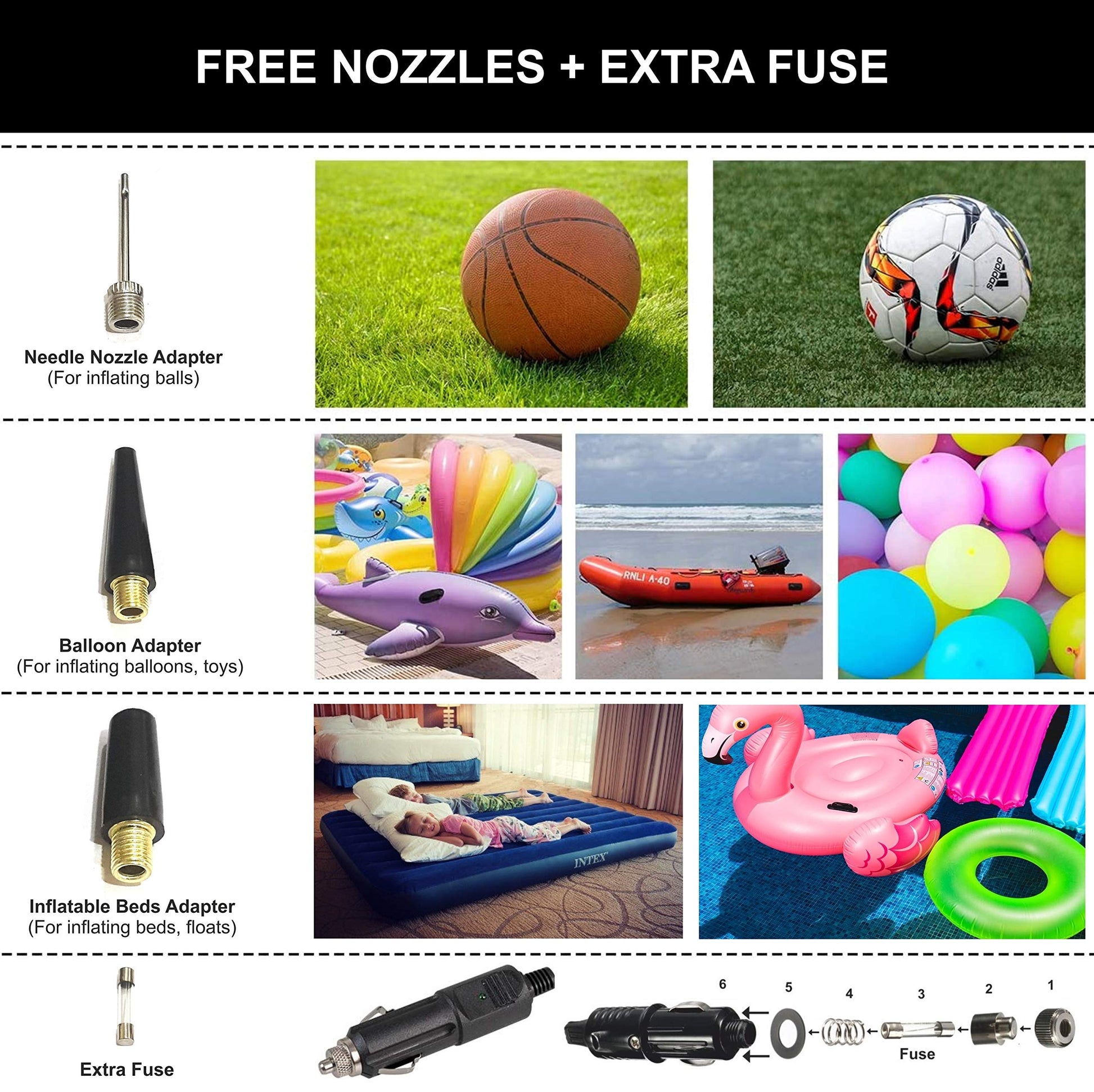 With free nozzles to inflate toys, inflatable beds, basketballs, footballs, bicycles, floats etc.