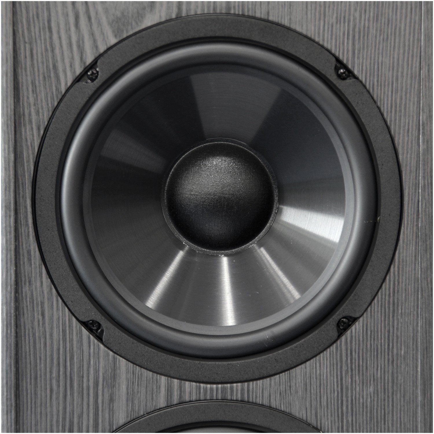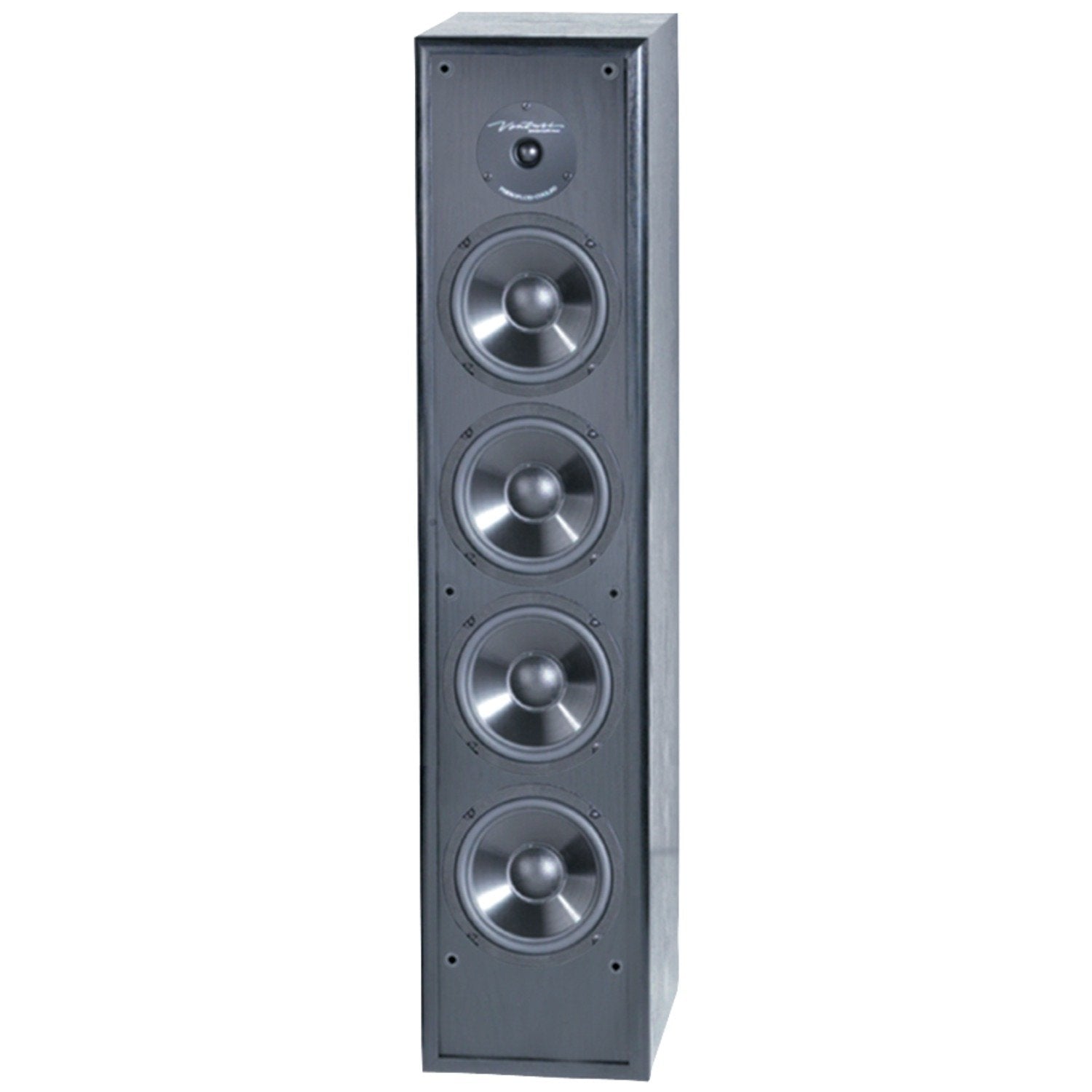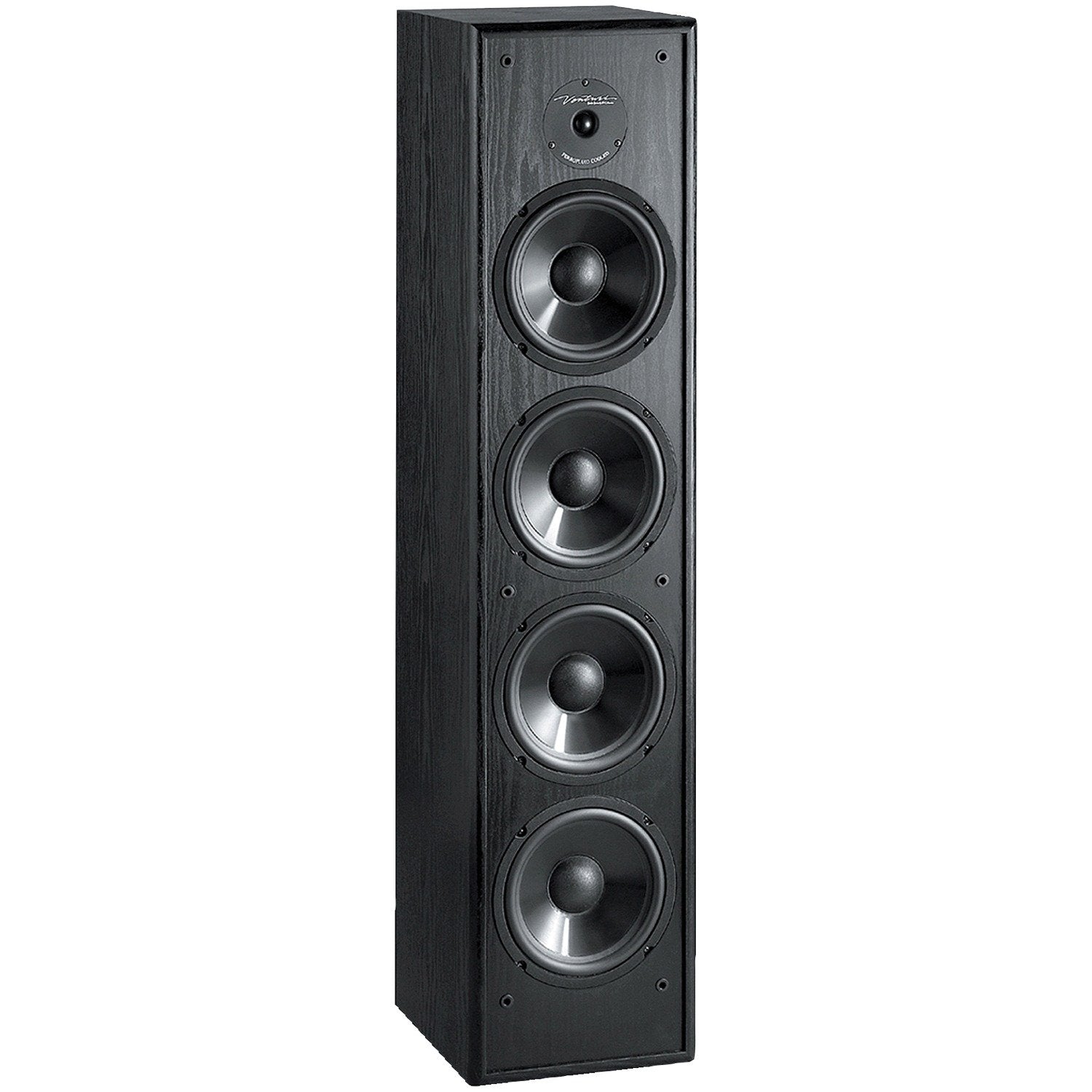 - 10W?200W per channel Two 6.5?poly graphite active woofers with two 6.5? passive radiators One .75? custom designed soft dome tweeter Frequency Response- 29Hz?21kHz Imp- 8? Sensitivity- 90dB Two -way, speaker system Rich, black wood-grain cabinet Dim- 38?H x 8.5?W x 9.25?D Gold-plated binding posts 34 Lbs. each Warranty- 7-year parts
